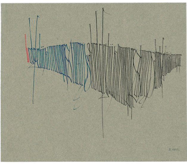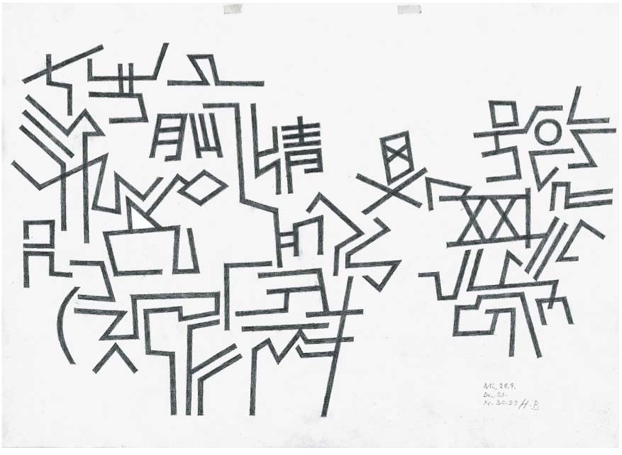 Und wo ich solche Äuglein nicht finde, kann ich sie vermuten. Ich sehe nicht nur die Formen und Bündelung von Linienzusammenhängen in Schriftnähe, sondern die Erinnerung an Skelett-Körper (die zuvor Thema formal verwandter Arbeiten waren), Erinnerungen an römische Zahlen, an bekannte und unbekannte Schriftzeichen aus allen Zeiten und allen Ländern. Du kannst diese Gebilde nicht ansehen, ohne nachdenken zu müssen – nur wird dir nicht mehr gesagt, worüber. Das mußt du selbst erspüren; auch die Titel, die Heinz Beier manchen dieser Titel gibt (»Der Unvollständigkeitssatz«, »Katakana«) helfen dir nicht dabei.