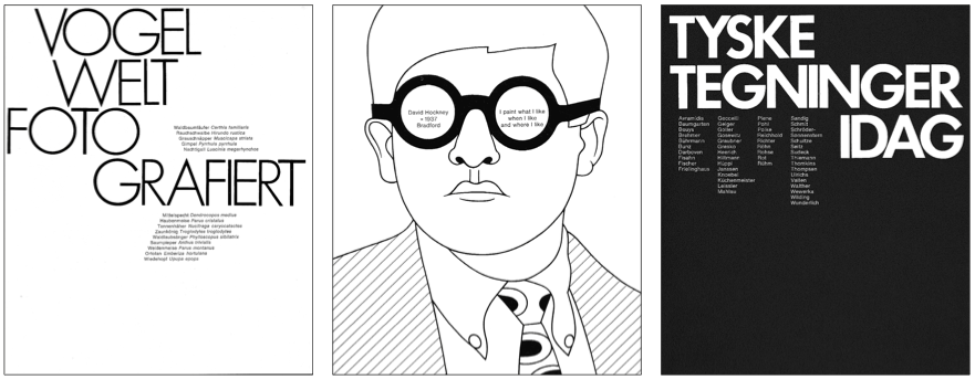 Der andere Strang ist Heinz Beiers Typografie. Hier zeigt er sich von einer anderen Seite. Nicht augenzwinkernd-spielerisch und nicht emotional engagiert, sondern klare Analyse der Aufgaben und Themen, die in klar geformter Grafik sich niederschlägt. Das muss sogleich revidiert werden. Die typografische Konstruktion ist durch und durch geklärt, doch durchaus nicht immer ohne Augenzwinkern. Die aus den Schrägen der strengen Futura gebaute Typo-Grafik »Vogel-Welt« läßt die kleinen Textzeilen bei aller typografischen Korrektheit flügelschlagend abschwirren, das hat feinen Witz. Ebenso die Zeilen im Glas der Brille des Hockney-Kopfes, in die Heinz Beier Hockneys Wort »I paint what I like/ when I like/ and where I like« platziert hat.