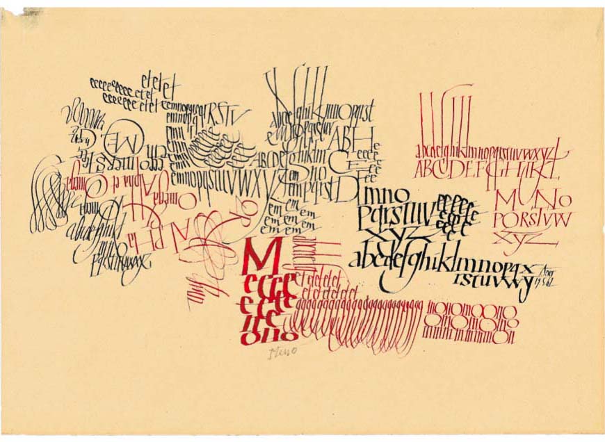 Das war aber nicht der einzige »Strang« in der großen Zeit der Kalligrafie, den zwanziger und den frühen dreißiger Jahren. Aus Wien kam die dekorative Schriftkunst von Rudolf Larisch, in Leipzig lehrte Walter Tiemann, in Berlin Emil Rudolf Weiß. Der Antipode Schneidlers war jedoch Rudolf Koch und seine Offenbacher Schule. Rudolf Koch ging es um den Ausdruck, um den Niederschlag seelischen Erlebens und Empfindens, um Volksverbundenheit und Glaubensnähe. Schneidler ging es um die Suche nach den formalen Möglichkeiten der Schrift. Er schrieb hunderte von Variationen der gleichen Buchstaben; jeder seiner Schüler sollte beim Schreiben seinen eigenen Weg suchen. »Anfangen, anfangen, immer wieder mit Ernst anfangen« war seine Devise. Rudolf Koch hatte gesagt: »Die Hand ist klüger als der Kopf«.